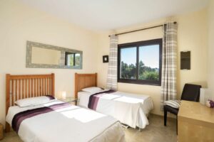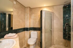 The spacious master bedroom features an en-suite bathroom with a bathtub, ample wardrobes, and room for a double bed and a desk. The second bedroom offers excellent space for two single beds and a large, elegant en-suite bathroom. There is also a separate guest toilet.