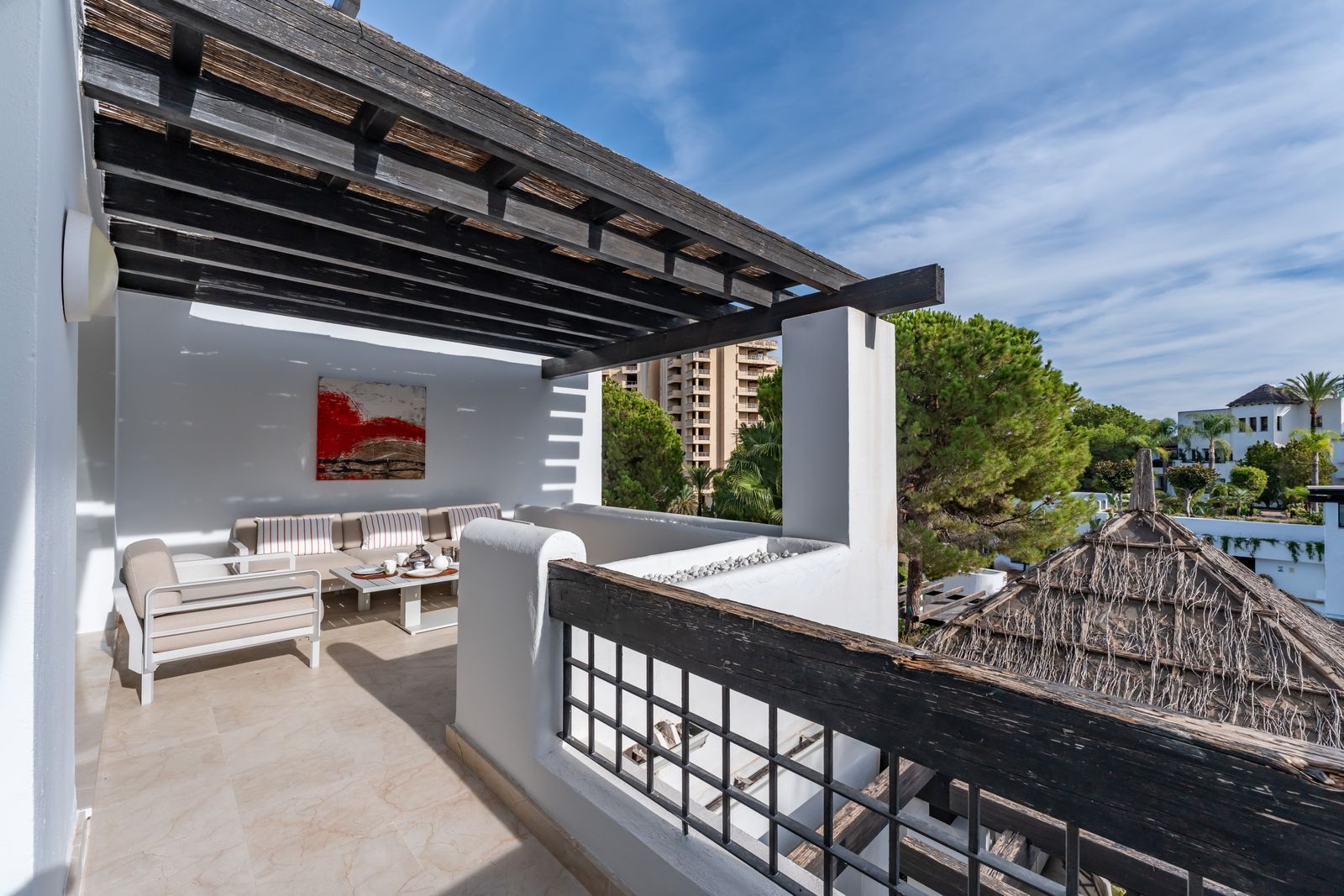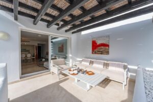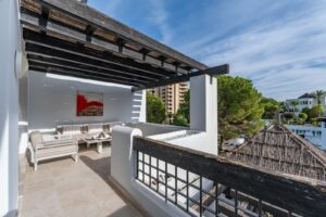 Originally a large one bedroom, this was converted to 2 bedrooms and one bathroom. As you enter the apartment, you are welcomed by the large open hallway that leads straight into the open plan lounge, decorated beautifully with high end furniture and fixtures. A cute white kitchen is to the right of the entrance and opens onto the dining room and lounge. Continue through the lounge and you come to the expansive, beautiful terrace that is facing the pool and south!