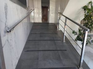 It has a washbasin with vanity unit, large mirror and good ventilation system.