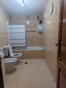 It has a washbasin with vanity unit, large mirror and good ventilation system. The bathroom is complete and very functional, with a bathtub and shower for added convenience.
