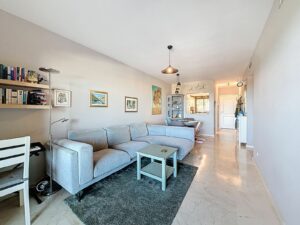The open-plan kitchen connects seamlessly with the living space, enhancing brightness and spatial flow. The apartment also benefits from hot and cold air conditioning.
