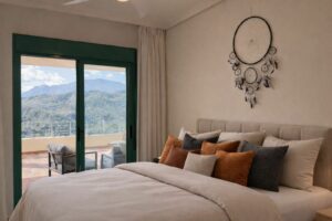 You have beautiful panoramic views of the forest and mountains, as well as some sea views, from this bright and spacious middle-floor apartment, located in a quiet and well-kept community in popular Monte Selwo, east of Estepona. The kitchen is fully equipped with high-end appliances from Neff. The apartment offers 98 m² of living area and a large 60 m² very private southwest-facing terrace where you can enjoy the beautiful landscape in front of you and from where you fantastic sunsets, perfect for relaxing and taking in the beautiful views. The terrace is partly covered and partly open. Inside, you will find a good-sized living room and two bedrooms, with the master bedroom featuring an en-suite bathroom, as well as a total of two bathrooms and a fully equipped independent kitchen. All rooms, including the kitchen, have direct access to the huge terrace. There is a built-in AC system for both cooling and heating. The property also includes a generous underground parking space and an approximately 6 m² storage room. Short-term rentals are not allowed, which keeps the community peaceful and residential. The community fee is very attractive at just €120 per month. The area is especially popular with Nordic residents and offers easy access to shops, services, and main roads. A great option as a permanent home, holiday property, or long-term investment. Located east of Estepona, it is approximately 14 km to Puerto Banús and 12 km to Estepona town.