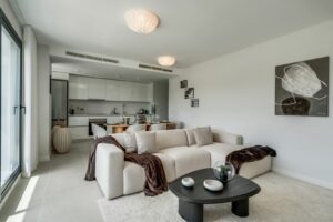 With a south-facing orientation, the apartment enjoys abundant natural light throughout the day. The open-plan kitchen and living area create a spacious and welcoming environment, and the property is sold fully furnished, ready to move in.