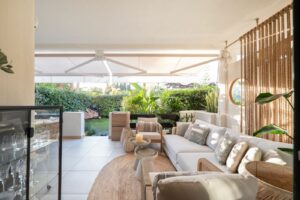 The apartment is located on the ground floor and features a generous total area of 173 m² including 2 large terraces and a private garden. The interior has been recently renovated to premium standards with great attention to detail, including high-end materials, quality finishes, and a tasteful interior design. The open-plan kitchen is seamlessly integrated into the bright and airy living room, creating a warm and welcoming space for both everyday life and entertaining.