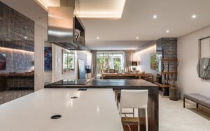 Exquisitely presented ground-floor apartment located in a 24-hour secured complex in Las Lomas del Marbella Club, in the heart of the Golden Mile. The property has been completely renovated and makes incredible use of the open floor plan that blends the kitchen, living room and large outdoor terrace seamlessly. Large floor-to-ceiling windows open up from the living room to a lush tropical garden and covered terrace with adjustable glass curtains that can be opened in the summer months to provide an incredible entertaining space within a very private setting. The apartment makes the most of the square meters and provides two spacious bedrooms, each with their own en-suite bathroom. The master bedroom opens up and connects with the large terrace towards the back of the unit. The complex offers an outdoor pool with wonderful sea views, gym and sauna for residents. The property comes with 1 parking space and a large storage room. Situated in a sought-after area, approximately half-way between Marbella Town and Puerto Banús.