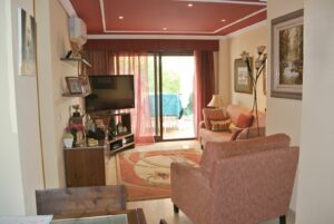 The apartment currently comprises a fully equipped kitchen, a bright living and dining area, two bedrooms and two bathrooms, one of them en-suite. Its standout feature is the 39 m² terrace, which enjoys open mountain views and overlooks the lush communal gardens, offering an ideal space to create a stunning outdoor living area.