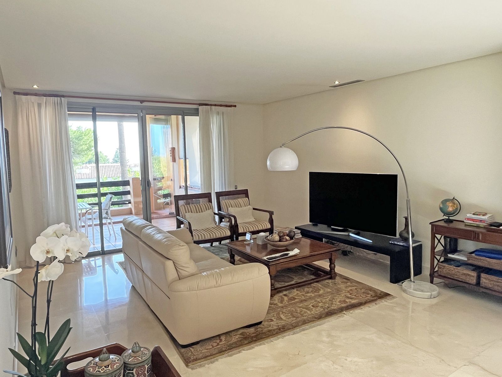 Located within the prestigious gated community Mansion Club, this elegant 2-bedroom, 2-bathroom apartment stands out as one of the finest residential offerings in the area. With a built area of 165 m² and a 41 m² south-facing terrace, it offers generous living spaces, natural light, and complete privacy. The terrace is fitted with glass curtains, allowing you to enjoy it year-round while taking in the lush tropical gardens and partial sea views.