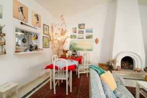 The property features a bright, open-plan design, where large windows flood the spaces with natural light. The fully equipped kitchen offers ample storage space and blends seamlessly with the spacious living room, the true heart of the home. The generous ceiling height, combined with the cozy fireplace, creates a warm and comfortable atmosphere.