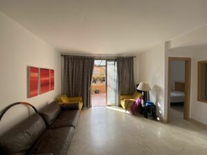 The property has two bedrooms with built-in wardrobes, a spacious living room with plenty of natural light, an open-plan kitchen with a laundry area, and a large private terrace. The master bedroom has an en-suite bathroom with a whirlpool bath. The living room and master bedroom open onto a large terrace where you can relax with family and friends, overlooking the communal pool and gardens.