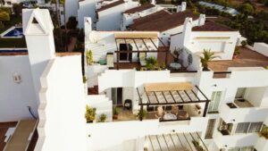 The location is ideal: while officially part of Estepona, the complex is actually closer to San Pedro de Alcántara, giving you the best of both worlds – Estepona’s tranquillity and Marbella’s vibrancy. Within ten minutes you can reach the world-famous Puerto Banús marina, with its luxury boutiques, fine dining, and nightlife. Málaga airport is just 65 kilometres away, less than a 45-minute drive. The nearest beach, Playa Saladillo, is only 800 metres from your doorstep, with charming beach bars where you can enjoy a meal or a drink, while supermarkets and shops are just a five-minute walk away. In the immediate surroundings you will also find a children’s playground and sports facilities and even a amazing golfcourse, perfect for families or those who enjoy an active lifestyle.