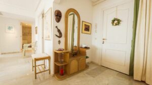 The apartment itself is move-in ready and exudes elegance. The generous living room with marble flooring forms the heart of the home and flows directly onto the terraces. There are two bedrooms and two bathrooms, one of which is ensuite and comes with fitted wardrobes. Everything has been impeccably maintained and finished with timeless materials, including extensive use of marble in the bathrooms. A special feature is the rooftop terrace with a 24 m² storage room, currently used as a workshop, but easily convertible into an additional bedroom, studio, or even a private sauna.