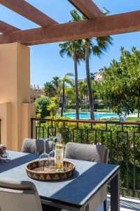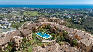 The community offers a range of high-quality amenities, including four swimming pools (one heated), a fully equipped gym, and beautifully landscaped gardens with fountains and a tranquil pond. One of the pools enjoys panoramic sea views, enhancing the sense of resort-style living. Golf enthusiasts will appreciate that several prestigious golf courses are just a few minutes’ drive away.