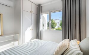 The double guest bedroom is accessed from a long private corridor and offers 2 single beds, wall to wall elegant white net curtains and double integrated sliding wood panelled wardrobes. Adjacent fully renovated spacious guest bathroom with contemporary tiling, marble top vanity unit and integrated ceiling spots.
