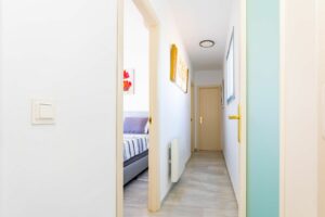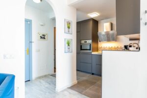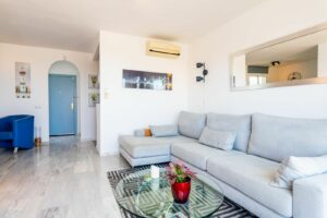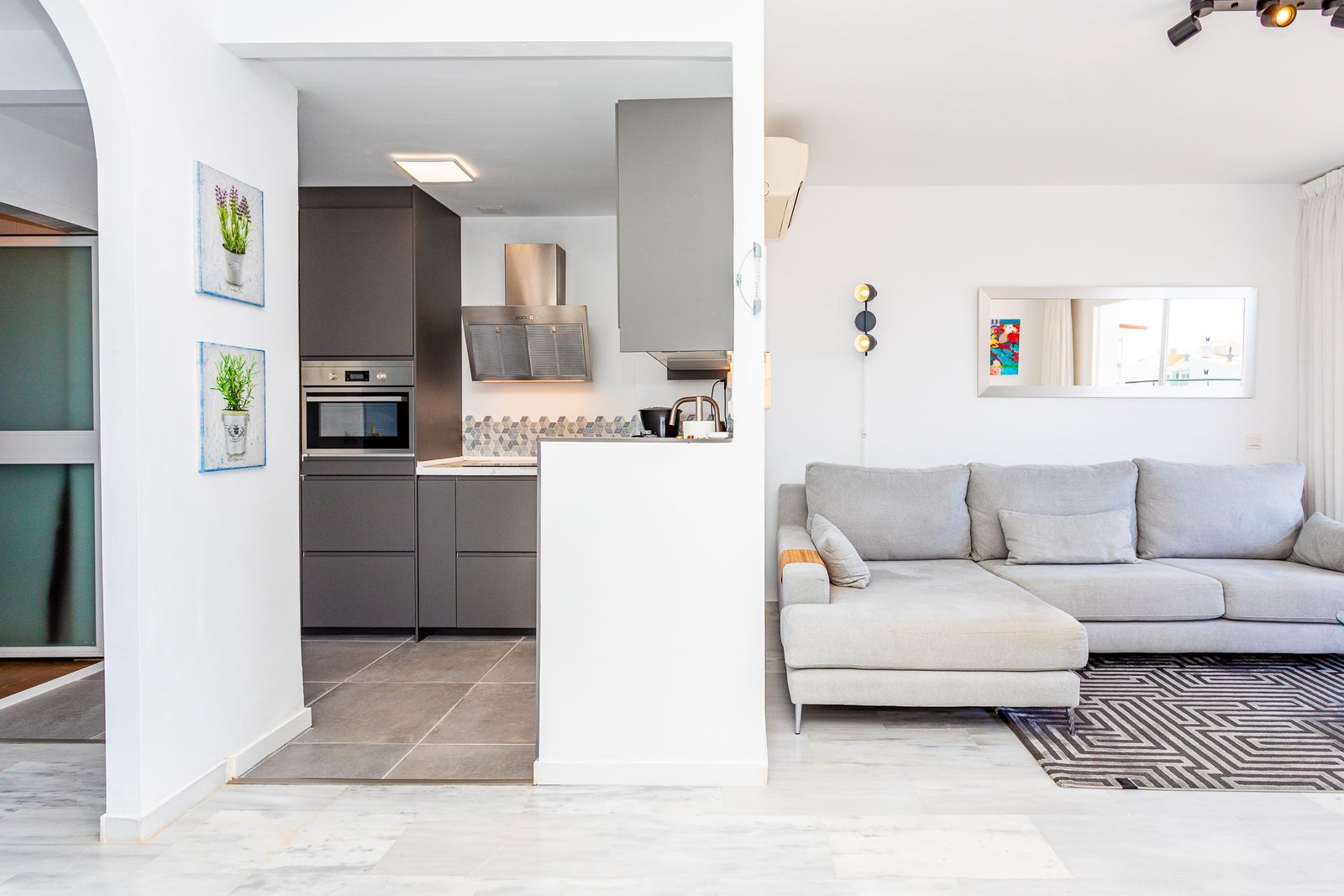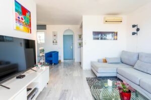 The heart of this penthouse is its recently renovated, open-plan kitchen that flows seamlessly into a bright and spacious living room. Thanks to large windows, an abundance of natural light fills the space, and you can enjoy spectacular views of the Mediterranean Sea.