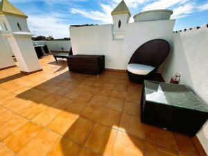 For sale: bright 2-bedroom penthouse duplex with spectacular views of the Mediterranean Sea. The property offers a spacious living-dining room, a separate kitchen with a serving hatch, a master bedroom, a second bedroom, and a full bathroom.
