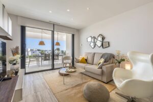 The apartment features two spacious bedrooms and two bathrooms. The modern kitchen is fully equipped with high-quality appliances and also includes a practical utility room. The living room is bright and airy, with large windows and sliding doors that open onto a generous balcony – ideal for relaxing or entertaining.