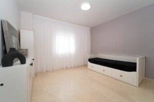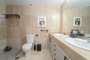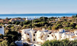 Bright and recently renovated 123 m² penthouse in the quiet area of Elviria, Marbella. The property offers two large bedrooms, two spacious bathrooms, a bright living area, fully equipped kitchen, and a private terrace with side sea and forest views. Features include window blinds and an electric awning. Located in a well-maintained complex with six swimming pools and lush gardens. Includes underground parking. Sold furnished.