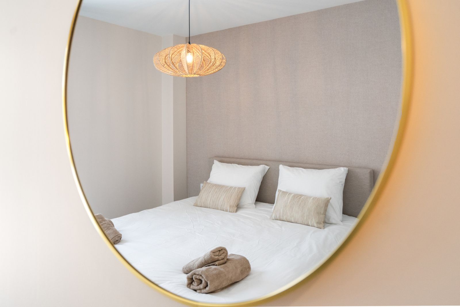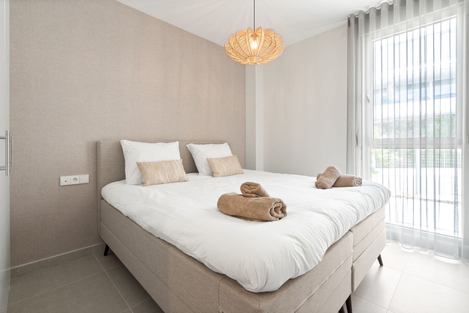 The interior is spacious and light-filled, with a modern open-plan living and dining area that connects effortlessly with the outdoor space. The fully furnished property is delivered turnkey, ready to move in and enjoy immediately. The kitchen is fully equipped with high-end appliances, and both bedrooms feature built-in wardrobes and elegant bathrooms.