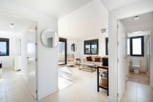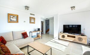 The heart of the home is the expansive living room, bathed in natural light and adorned with panoramic views of the sea and majestic mountains. Step outside onto the vast private terrace, where you can bask in the beauty of the lush communal gardens below and admire the tranquil vistas of the surrounding landscape.