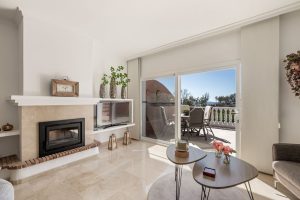 Situated on the first floor, the apartment offers a spacious and bright living room with a fireplace and access to the terrace boasting a SW orientation and sea views.