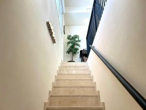 A marble staircase leads down to the bedrooms, both spacious with private terraces and a modern shared bathroom.