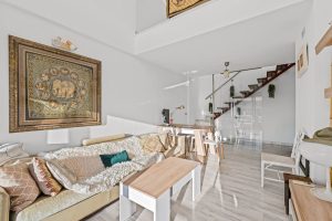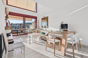 Spacious two-bedroom duplex penthouse enjoying open views of the surrounding mountains and countryside, situated in a popular residential complex in the hills above Selwo, between San Pedro de Alcántara and Estepona. The location offers a peaceful natural setting within ten minutes’ drive of the coast and local beaches.