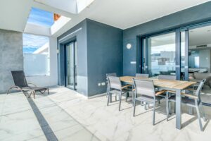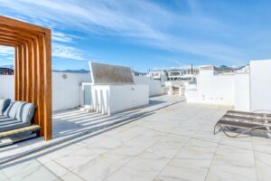 Beautifully maintained and set in an exclusive gated community along Estepona's sought-after New Golden Mile, this penthouse apartment is just 500m from local amenities and a short walk to the beach. Positioned in one of the best spots within the community, the property enjoys fantastic views across the manicured tropical gardens, swimming pool, mountains, and the sea beyond. It’s a calm, elegant space designed for effortless coastal living. Inside, the apartment offers a bright open-plan layout with a sleek American-style kitchen, premium appliances, and underfloor heating in the bathrooms. The spacious living area flows onto a large private terrace perfect for dining outdoors or soaking up the Mediterranean sun. Both bedrooms are generous and filled with natural light, and the master suite opens directly onto the terrace, featuring an en-suite bathroom, while the second bedroom is ideal for guests or family, with a full second bathroom adjacent. A solarium of over 100m2 offers panoramic views ideal for outdoor dining and entertaining.