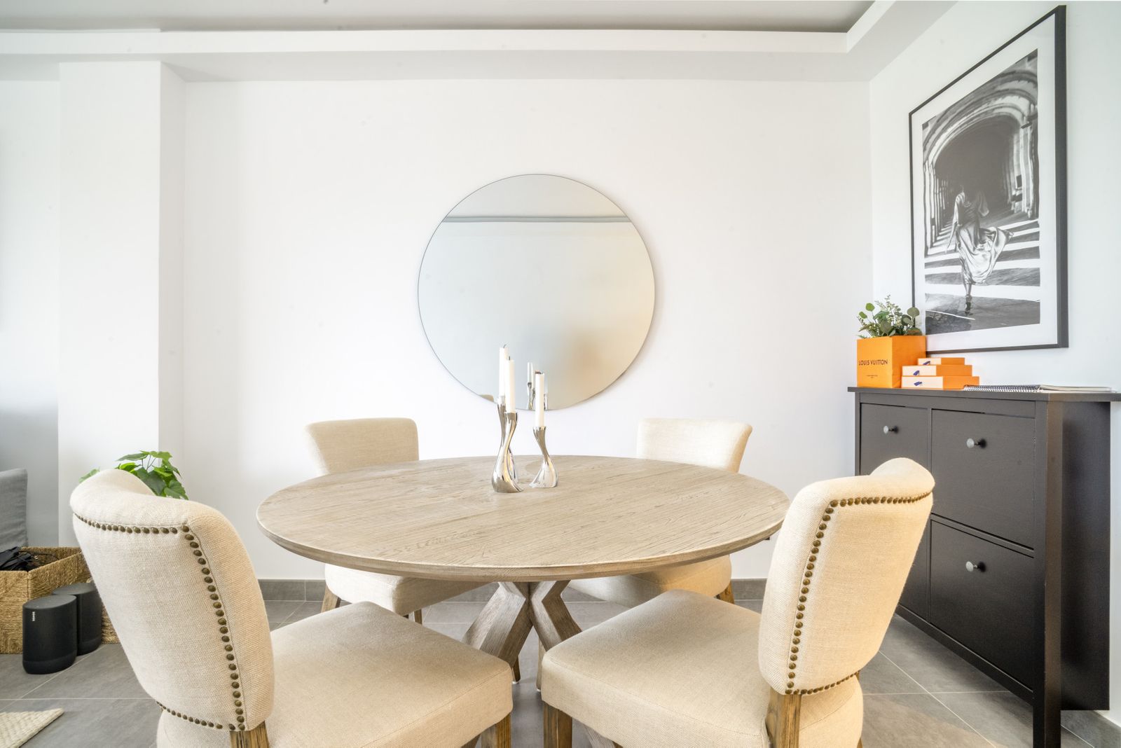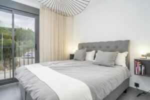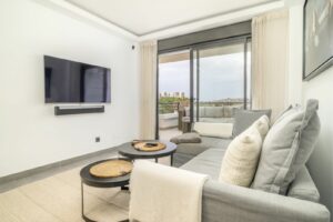 The interior follows a contemporary Scandinavian style, defined by clean lines, bright spaces, and high-quality finishes. The open-plan kitchen, equipped with Siemens appliances, integrates perfectly with the dining and living areas, creating a fluid layout suited for both relaxed living and entertaining. Large sliding doors lead to the west-facing terrace, where residents can enjoy panoramic views over the Los Arqueros golf course and surrounding mountain landscape. From here, sunsets are particularly striking, making evenings on the terrace a highlight of the property.