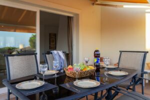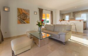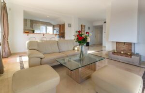 • A spacious and bright lounge with direct access to a large South and West-facing terrace (72 m2) offering panoramic views of the Mediterranean Sea and the mountains. It features a cozy fireplace and has an adjacent office/TV room
