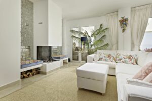 The complex is modern, with clean lines and a lovely swimming pool area, where one can spend a relaxing morning or afternoon in the sun or under a tropical-style parasol. The gardens boast mature vegetation, like olive trees, that offer a lovely natural shade during the summer heat. Residents also have access to a clubhouse featuring a gym with weights and other equipment, a large TV for watching sports or movies, a lounging area for parties and gatherings, a fully equipped kitchen, a bathroom, and a lovely terrace with a dining table. The area is one of the safest in Marbella; still, the community is gated and has security cameras throughout the property.