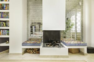 The living room is perfect for a cozy gathering, featuring a bespoke fireplace and a beautifully designed accent wall as the focal point, giving the space a sense of warmth, elegance, and serenity. The built-in shelves are a really nice feature, and can be used to display books or decorative items. On the opposite side of the apartment, we find the guest bedroom, stylishly furnished with a double bed and even a quaint, built-in desk and shelves, perfect for a quiet retreat. We also see the downstairs bathroom, which offers a spacious shower with large slabs and specialty fixtures.