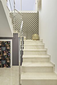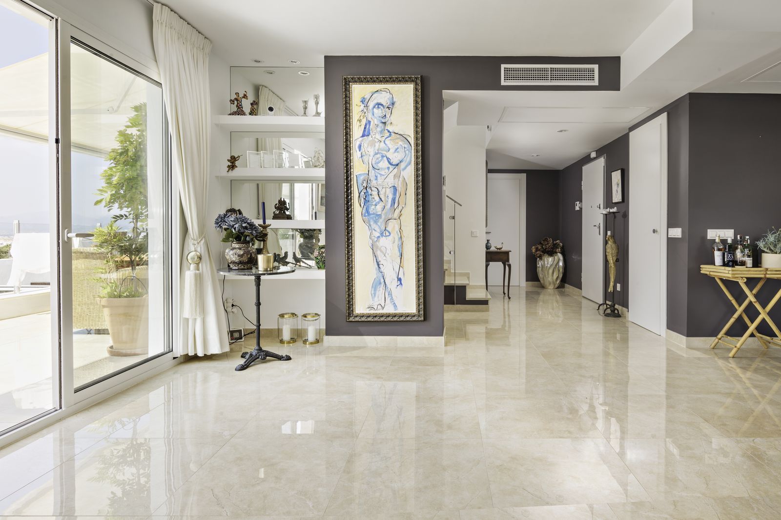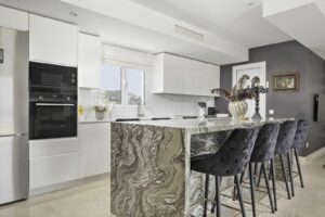 A semi-private elevator takes us to this fantastic penthouse. On the first level, we find a bright and spacious open-plan living area, with raised ceilings that give this particular apartment a feeling of openness as you walk in. This duplex has beautiful Porcelanosa flooring throughout, and a well-equipped kitchen that features a gorgeous quartzite countertop island, perfect for entertaining or enjoying a relaxing brunch. A pretty view of the hills can be enjoyed from the window over the sink. All ceiling lights throughout the house are energy-efficient and dimmable, for an easy change in ambiance depending on the occasion.