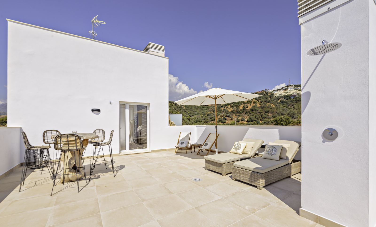 A sophisticated modern stairway with a large window (offering sea views) leads us upstairs to the master bedroom, a luxe and inviting space where one can enjoy spectacular views of the sea and coastline while lounging in bed. On a clear day, the outline of the African mountain range can be seen, along with Gibraltar and the nearby Sierra Blanca mountain range. The room comes with ample built-in closets. The ensuite bathroom is done in black slabs with white veining, which, juxtaposed with the white sink and cabinetry, makes it simply stunning!! On that same level, we find a large second terrace, ideal for sunbathing, as it is entirely private, where one can enjoy a snack at the high table and, undoubtedly, the incredible 360º views. It comes equipped with an outdoor shower, a nice addition for a quick refresh while enjoying the summer sun.