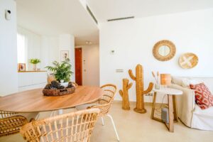 The open-plan living and dining area connects seamlessly with a fully equipped kitchen fitted with high-quality Siemens and Bosch appliances. A separate utility room with washer and dryer adds practicality. The property also features hot and cold air conditioning throughout, underfloor heating in the bathrooms, and excellent natural ventilation thanks to its elevated position.