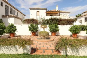 Inside, the private corner home is filled with natural light and Andalusian charm, beautiful neutral marble floors and marble bathrooms, granite counters in the kitchen featuring preserved architectural details, wood-and-glass doors throughout and balcony and an inviting open-plan design flowing to a spacious private terrace—perfect for year-round sunshine, evening tapas, or morning coffee surrounded by lush gardens, nature and greenery.