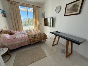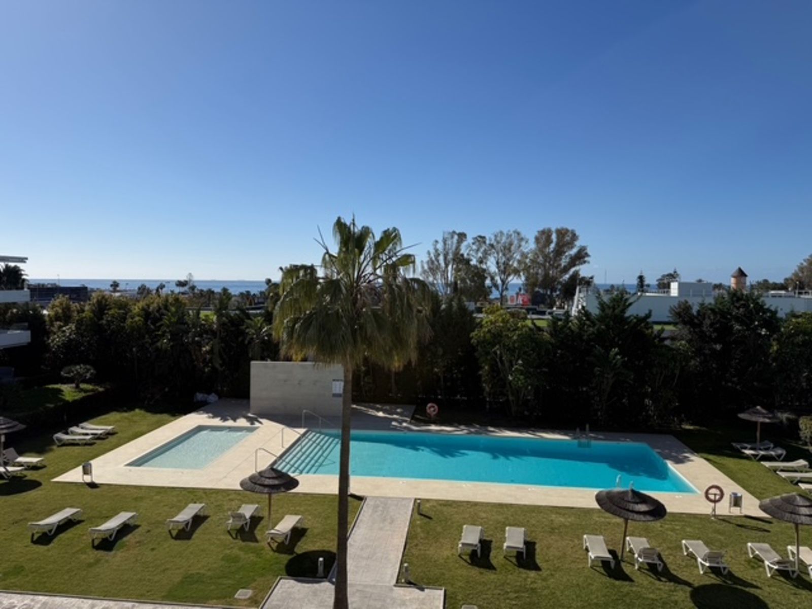 The living room leads to a terrace overlooking the beautiful pool and gardens of the complex and the best frontal sea views.