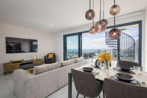 One of the true highlights is the spacious private rooftop solarium featuring a jacuzzi and breathtaking 360-degree panoramic views of the open sea and surrounding mountains — the perfect setting to enjoy the Mediterranean climate all year round. The elegant living area flows naturally onto a second generous terrace, creating a beautiful sense of openness and comfort.