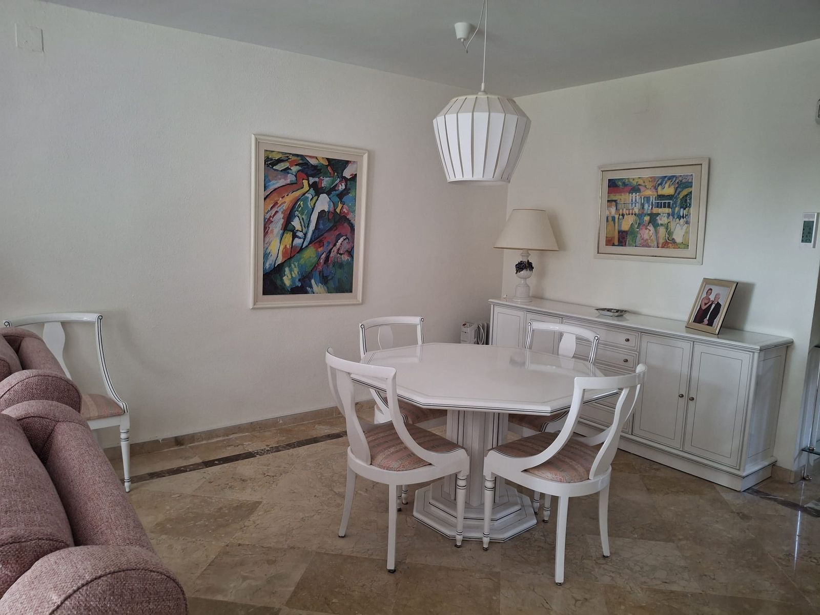 Townhouse located in a small Andalucian pueblo style community in Nueva Atalaya. The property is situated in a quiet cul de sac close to all local amenities, shopping centre, schools and golf. The community boasts a large swimming pool and park sized landscaped gardens. The south facing house is built on 2 levels with an entrance hall,with a comfortable lounge dining area and a modern kitchen on the ground floor.. On the second floor it has 2 bedrooms, 2 bathrooms, one on-suite and two terraces. The lounge and terraces face onto the large communal gardens with a sea view from the main bedroom .It is well presented with a modern kitchen, air conditioning and fireplace in the lounge. Private parking directly in front of the house.