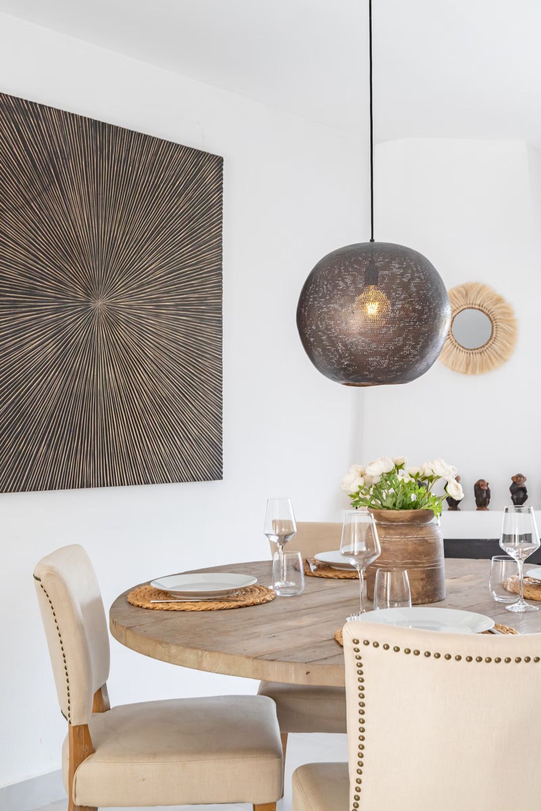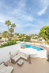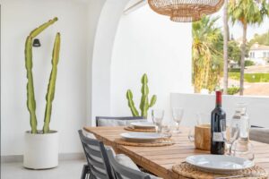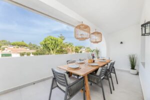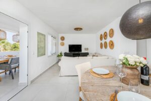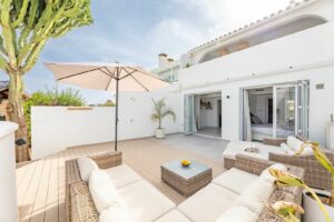 East Marbella, Elviria centre. For sale fantastic renovated and charming townhouse in Pueblo Sueco. This townhouse was refurbished to high quality standards in 2018 and beautifully decorated throughout. The property has a modern feel of top quality and is built over 2 floors. When entering the plot you will find an inviting west patio partially covered. It is furnished with chillout daybeds and there is lots of space for al fresco dining. There are mature types of spectacular cactus and easy maintaining planters. Entering the house you will find a handy guest toilet on the right and the fully equipped kitchen with all the necessary appliances. Also in the kitchen a cosy window to the front patio. The living room has large folding doors to the terrace, good space for two 3 seater-sofas and a nice round dining table next to the fire place. From the living room you access a lovely and spacious covered morning terrace with a 6 seater table, perfect to enjoy your breakfast! The stairs take you to the lower floor where we find a good sized bedroom with another auxiliary bedroom which could be used as dressing room. Another bedroom with a lot of extra space with a desk and dressing area. There are two bathrooms with generous showers, (one ensuite) and a washing/ storage room. These two bedrooms lead you to the patio on the lower floor from which you can access directly to the private pool club. At the patio you will find a beautiful deck where you can relax on the sunbeds and refresh using the solar shower. You can optionally be a member of the club for a yearly fee. There is Daikin hot and cold air conditioning system, underfloor heating in the bathrooms and high speed fibre optic. The neighbours are a combination of local and international nationalities. There is only a 10 minute walk to the best beach in Marbella, a 10 minute drive to Marbella city and less than 45 minutes to Malaga airport. There are as well several 18 hole golf courses like Santa Maria Golf, Santa Clara, Rio Real and Marbella Golf. Marbella has become a brand in Europe and all over the world with 320 days of full sun a year and total of 2900 hours of sun. Elviria represents the very essence of quality of life on the Costa del Sol. It is located in a unique natural setting and has a fantastic range of facilities nearby, including three 4-and-5 star hotels: Don Carlos, Marriott and Estrella de Mar, renowned golf courses such as Santa MarÃa and Green Hills, a Michelin-starred restaurant, Nikki Beach Club and one of the best beaches on the coast, all flanked by outstanding bars and restaurants, supermarkets and a local street market every Friday and an organic market every other Saturday. In addition, there is a Town Hall, doctor's office, post office, a wide range of schools, including private schools…all within walking distance. This is a unique opportunity and the ideal location for both a permanent residence or dream holiday home.