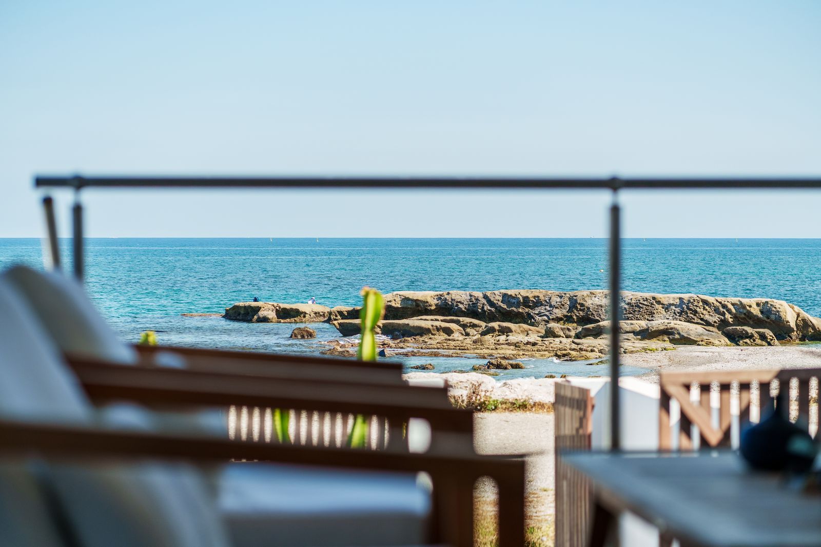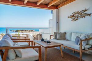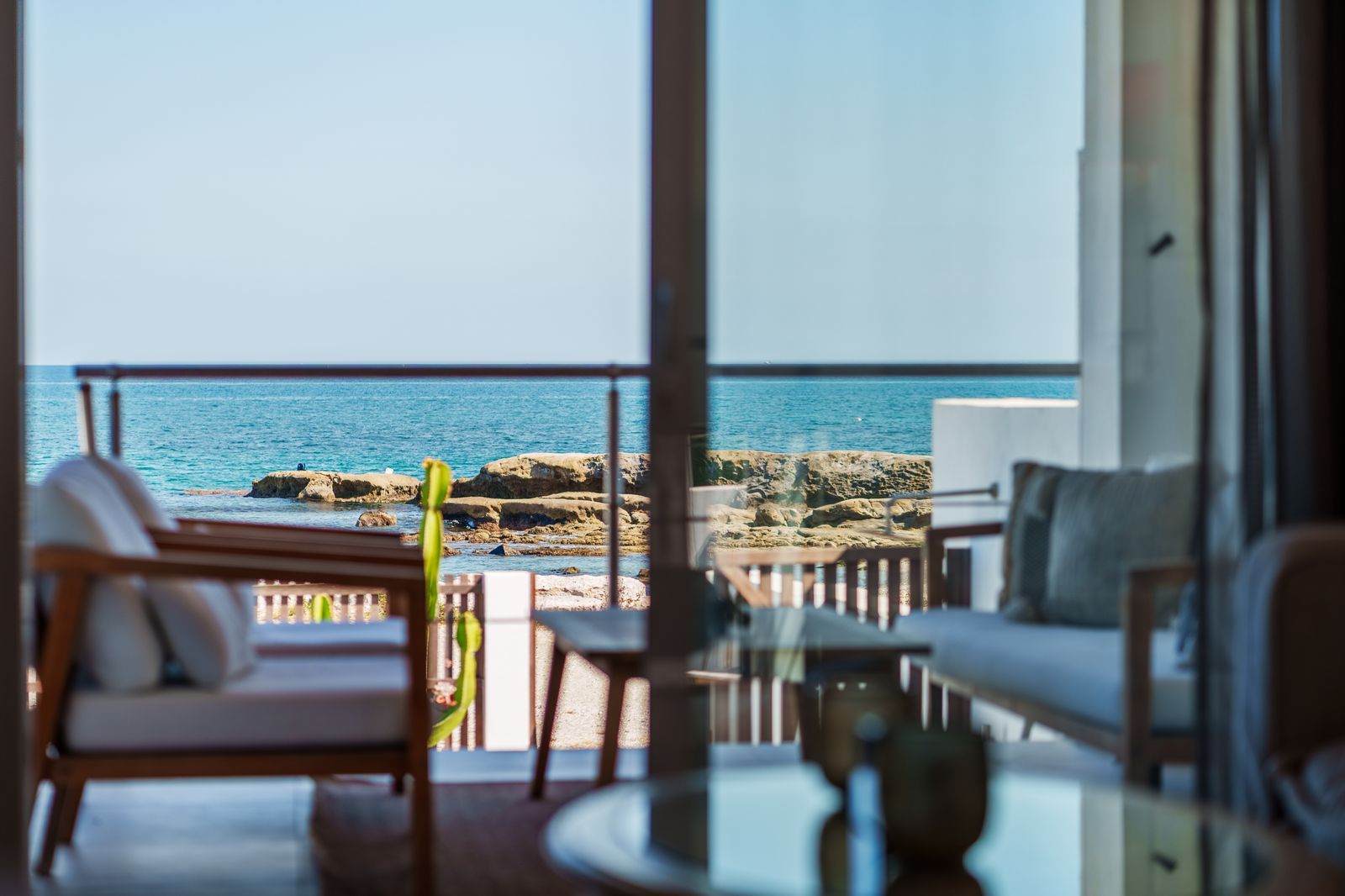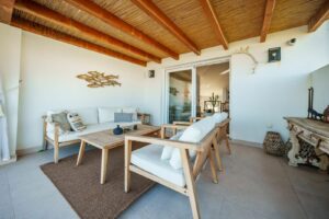 Above, the elevated covered terrace provides a sophisticated sitting area, complete with comfortable sofas and a stylish coffee table, where you can enjoy unparalleled sea and beach views from the privacy of your own retreat.