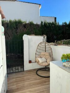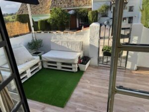 Townhouse for sale in Rio Real, renovated 3 years ago, with laminate flooring, PVC windows, air conditioning on the ground floor, and an open fireplace. With two bedrooms with sloping ceilings that give a sense of spaciousness and a rustic touch. A full bathroom with a shower on the upper floor and an outdoor toilet on the ground floor. Open concept design with integrated kitchen and ample storage. Two terraces ideal for sunbathing or relaxing in your armchairs. Located in a small and quiet urbanization with green areas and a communal pool. Only 10 minutes from the center of Marbella.