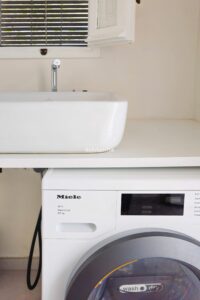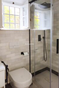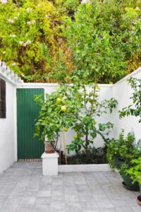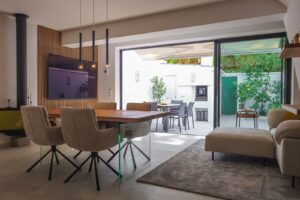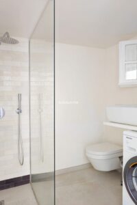 Fully renovated with a contemporary sensibility, the home unfolds across two levels designed to maximize both space and natural light. On the main floor, an airy open-plan living and dining area flows seamlessly into a sleek modern white kitchen. At its heart, a sculptural iron-and-glass fireplace introduces warmth and elegance, while floor-to-ceiling glass doors open onto a sun-drenched private patio—an ideal setting for relaxed mornings, al fresco dining, or evening gatherings. Adjacent to the terrace, a charming, cleverly designed outbuilding houses a laundry area, toilet, and shower, combining functionality with discreet style.