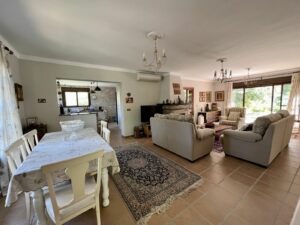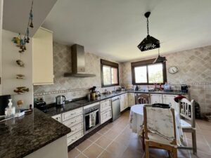The spacious kitchen, with a pantry, is designed for both daily living and dining. From here, you can access a covered porch of approximately 40 m², ideal for al fresco dining and family gatherings.