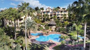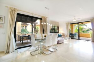 Situated in the exceptionally beautiful development of El Campanario and just a short walk from a host of different shops and amenities lies this large 3 bedroomed, south/west facing corner, garden apartment. The apartment enjoys open views and looks out over the award winning tropical gardens with its streams, fountains and lovely pool area. The property is larger than most three bedroom apartments and due to the large windows and patio doors that lead out onto various terraces, the living room has a very bright and airy feel to it. Both terraces have direct access to the gardens, from which you can wander down to the pool area below. The new kitchen has recently been put in and it comes fully fitted with Bosch appliances, including washing machine in the separate laundry room. All three bedrooms are very spacious, with the master suite also being recently renovated. There is a separate guest toilet as well as plenty of built in wardrobe space throughout. The property is fully airconditioned with underfloor heating in the bathrooms. The property also includes two big underground parking spaces (one of which is on a separate title deed) plus a 6m2 storage room. The complex is fully gated and has security guards 24h. The fabulous El Campanario clubhouse with its 9 hole golf course, Indoor pool, Gym and Spa plus the poolside restaurant are situated just across the road, and the beach is just over 20 minutes walk away.