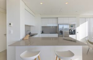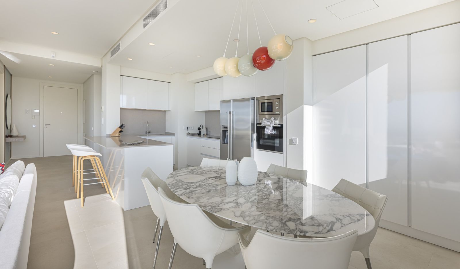The interior of this residence blends contemporary elegance with absolute functionality. The spacious living-dining area, featuring a comfortable sofa, opens up to a fully equipped open-concept kitchen with high-end appliances and a breakfast bar ideal for socializing. This space is designed for comfort and connection in a warm, welcoming atmosphere.