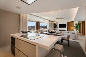 The property features a bright open-plan living and dining area with floor-to-ceiling glazing, a gas fireplace, and seamless access to the terrace—ideal for both relaxed living and entertaining. The terrace is further enhanced by a fire pit feature, creating an inviting outdoor space for year-round enjoyment. The high-end open kitchen is fully equipped and designed for modern lifestyles.