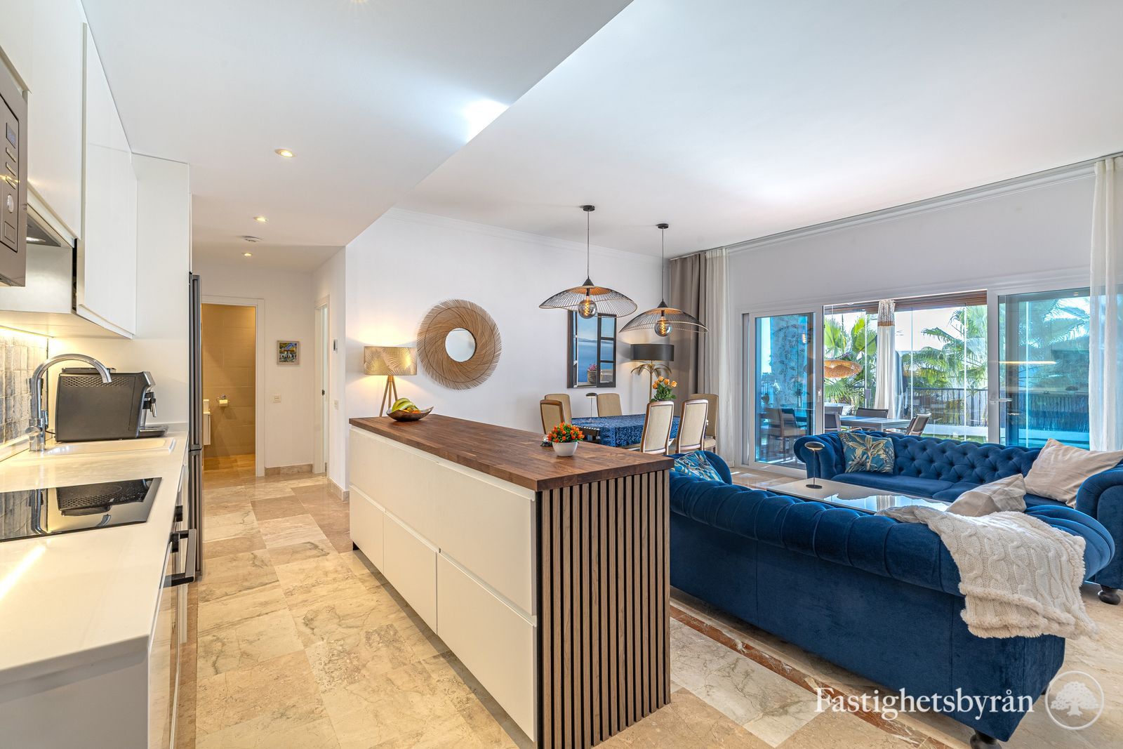 Welcome to this modern and stylish home in the popular Paraiso Pueblo in Benahavís. Here you are greeted by a bright residence with an open-plan layout where the kitchen and living room blend harmoniously together. The kitchen is tastefully designed with decorative tiling, integrated appliances, and a spacious kitchen island that creates a natural gathering point.
