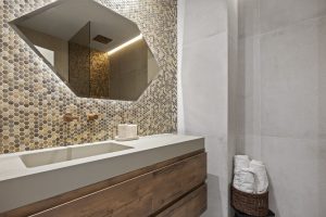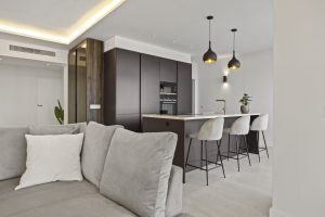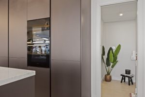 The apartment provides a total built area of 186 m², including 133 m² of interior living space and a 37 m² terrace that extends the principal rooms outward. The layout centres on an open-plan living and kitchen area, designed to promote flow between daily living and social gatherings. Clean architectural lines, recessed ceiling lighting, and neutral materials create a cohesive and modern interior expression. The kitchen integrates seamlessly with the dining and lounge areas, forming a functional core of the home. Three bedrooms are well proportioned, with two en-suite bathrooms and an additional guest toilet. Each bathroom is finished with contemporary fittings, combining practicality with understated design.