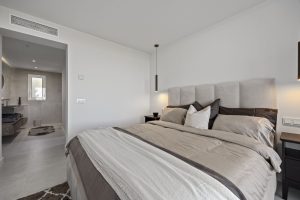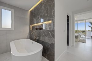 The 37 m² terrace acts as a natural continuation of the interior, offering space for seating and dining while framing panoramic views of the surrounding valley, Mediterranean coastline, and mountain backdrop. The elevated setting enhances privacy and airflow, reinforcing the sense of retreat without isolation. The communal pool and landscaped gardens within the development provide additional outdoor leisure options, including a separate children’s pool.