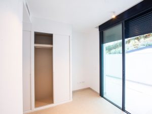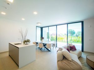This ground-floor apartment comprises three bedrooms, two bathrooms, a living room with an open-plan kitchen, and a terrace with a private garden.